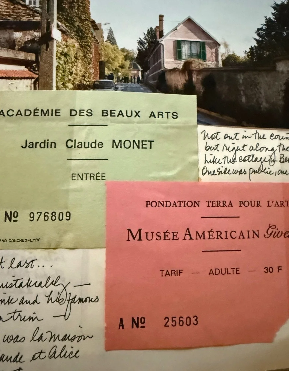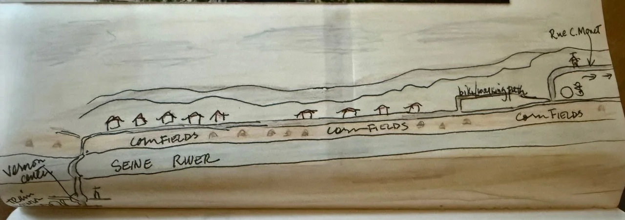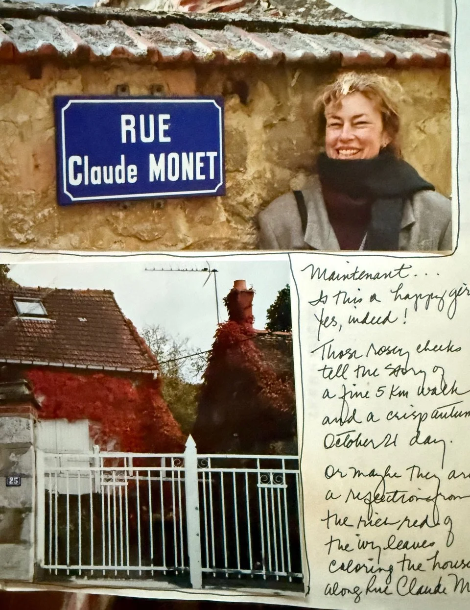 Reopening my 1992 Paris Journal, I turn to the events of my 47th birthday on October 21.10.92—a trip by train from Paris to Vernon and the 6 K walk that followed to the village of Giverny. Tucked into the journal are penned notes, train and museum tickets, photographs, and hand-drawn maps of that unforgettable day. At the top of my first entry that day is a postcard of la Gare Saint-Lazare painted by Claude Monet in 1877. And so it begins….