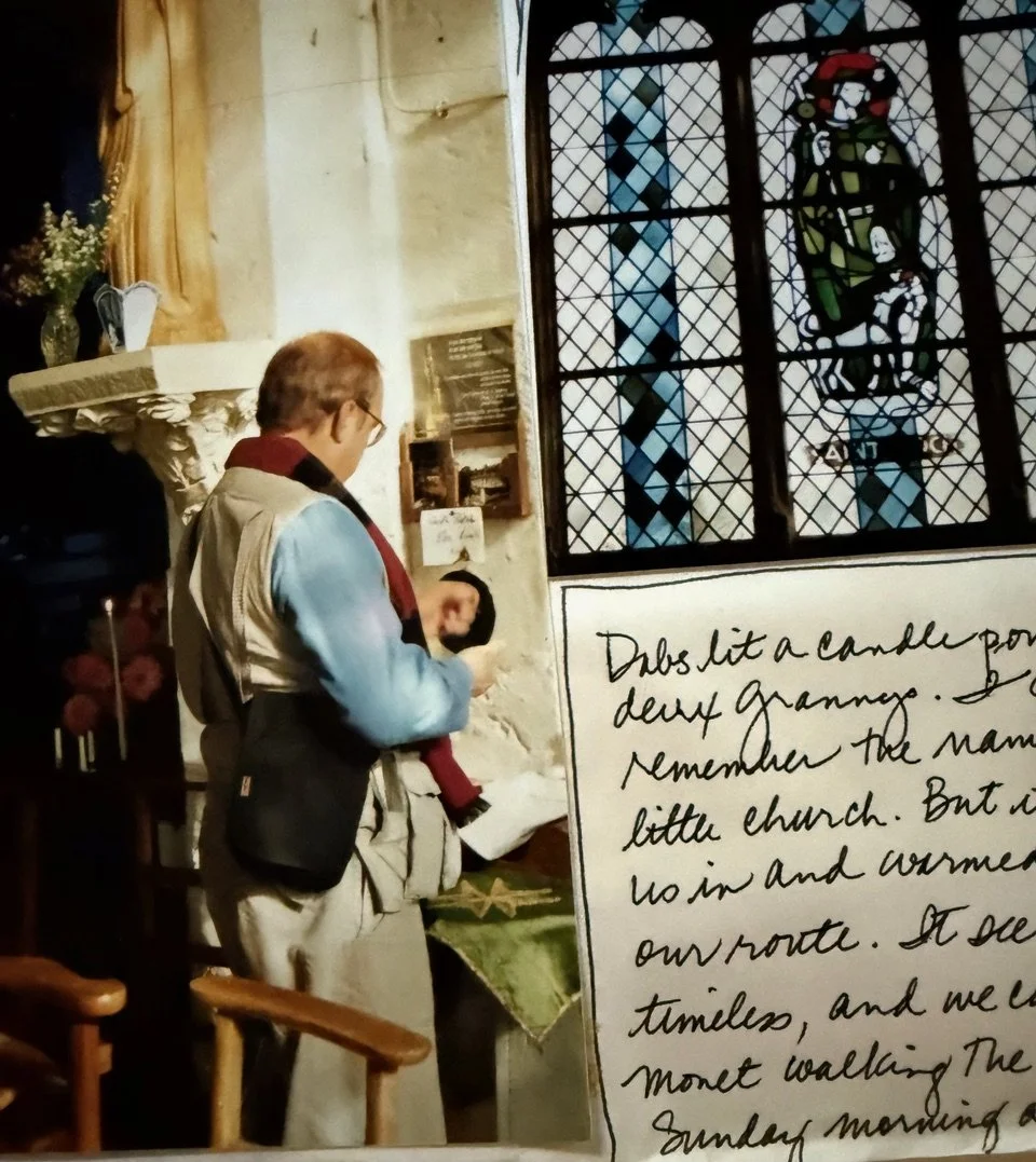 Before reaching Maison #25—Monet’s home and gardens—we paused at Eglise Sainte-Radegonde—a country church and cemetery where we found a monument aux morts pour la France…1945-57 (Indochine). The tiny church was empty inside. The stone floor arrayed with small wicker chairs. Warm light poured into the room and warmed the cold blue stone. Kit lit candles for his mother and my grandmother. The scene felt timeless, and we imagined Monet walking there on Sunday mornings a century ago.