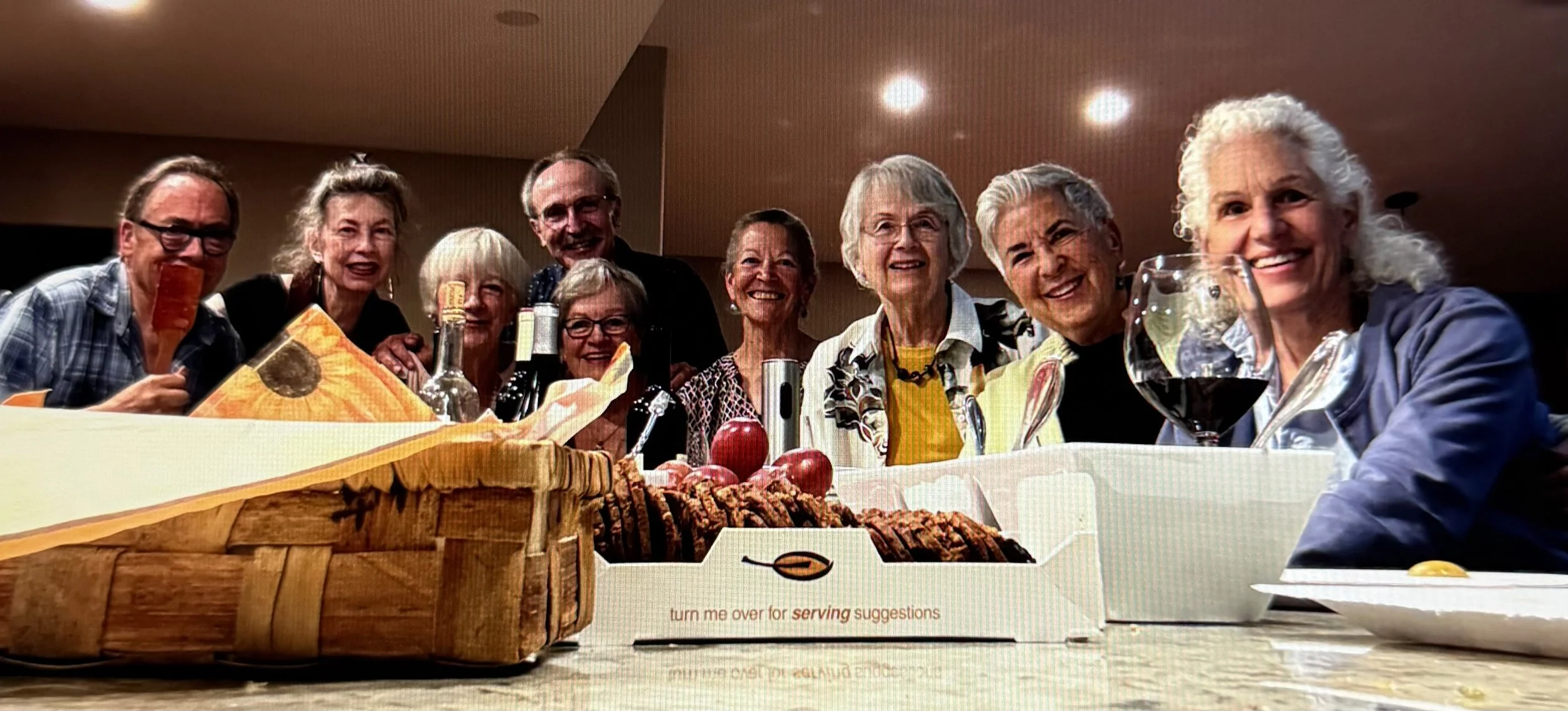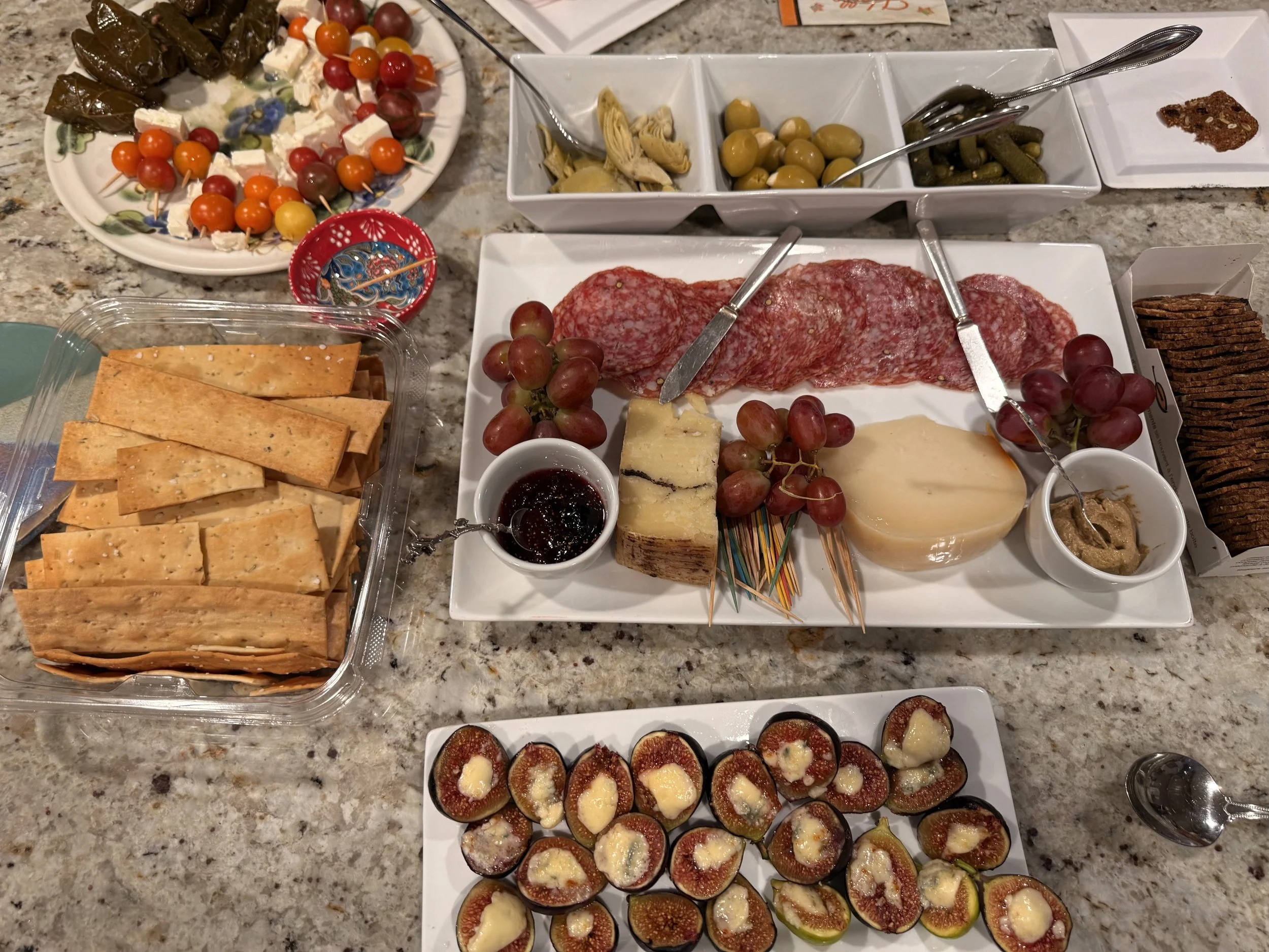 Then there was cause for a gathering of friends. Don and Elaine invited nine of us to bring a dish and come for a pasta and shrimp dinner. No wine necessary. Elaine had just driven from Oregon and had plenty of bottles of Oregonian wines in her trunk. We signed up for assorted hors d’oeuvres and a salad, and I promised to make a dessert with figs and pears.