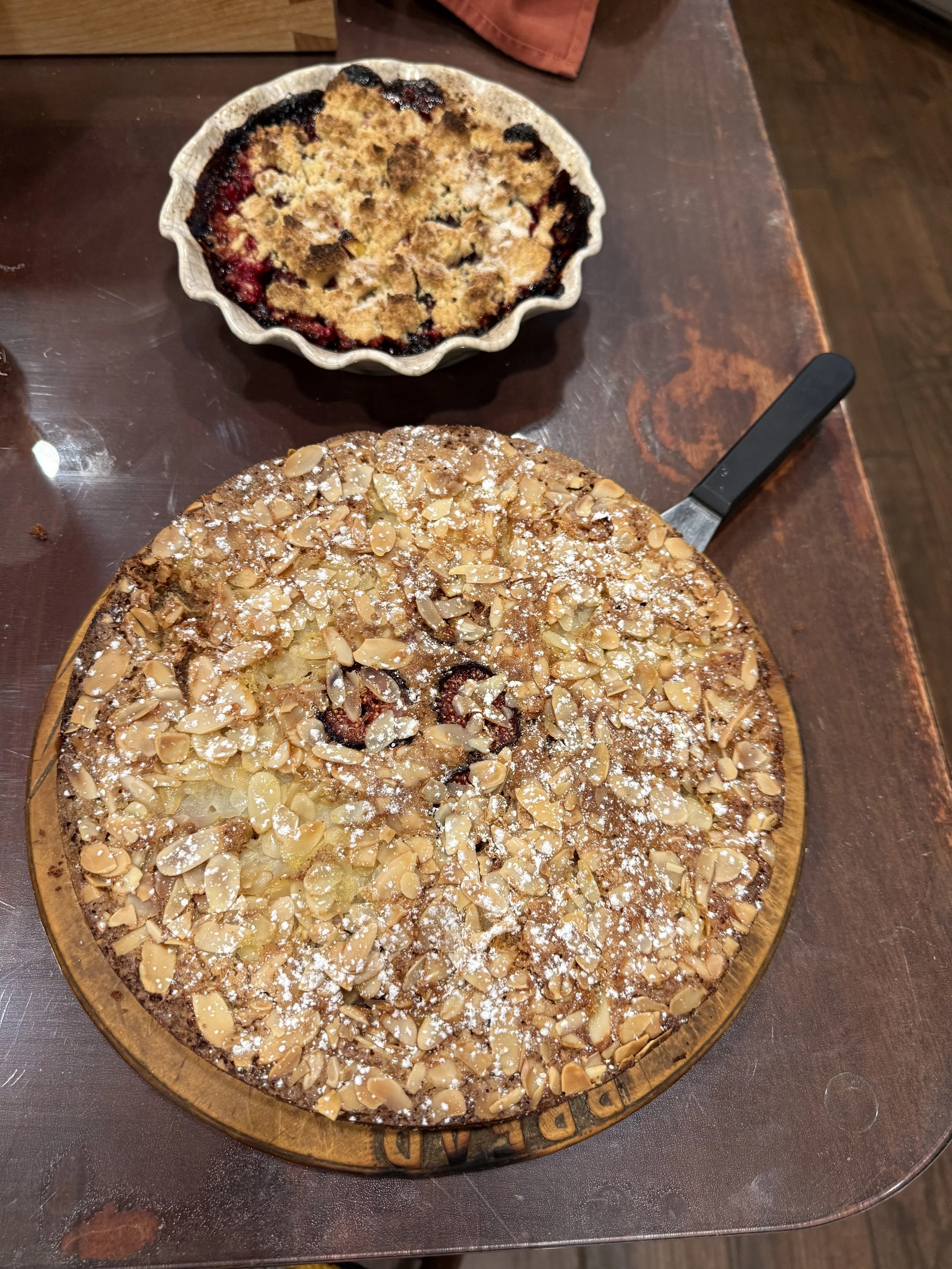 In the New York Times Cooking.com offerings, I found a Pear-Almond Cake by David Tanis. It is a simple cake of sliced pears in an almond flour batter baked in a 9” or 10 “springform pan. I had fresh pears from a neighbor’s orchard and beaucoup ripe figs, so this utterly delicious tart-like pear-almond cake was enhanced with circles of figs as well. Mindy pronounced the cake “transformative” and everyone wanted the recipe. It was a magic night of shared food, wine and laughter—something we were all in need of. And because we can walk to each other’s houses, we can dress up but arrive in our bedroom slippers. No need to worry about driving after a glass or two of wine plus champagne with dessert.