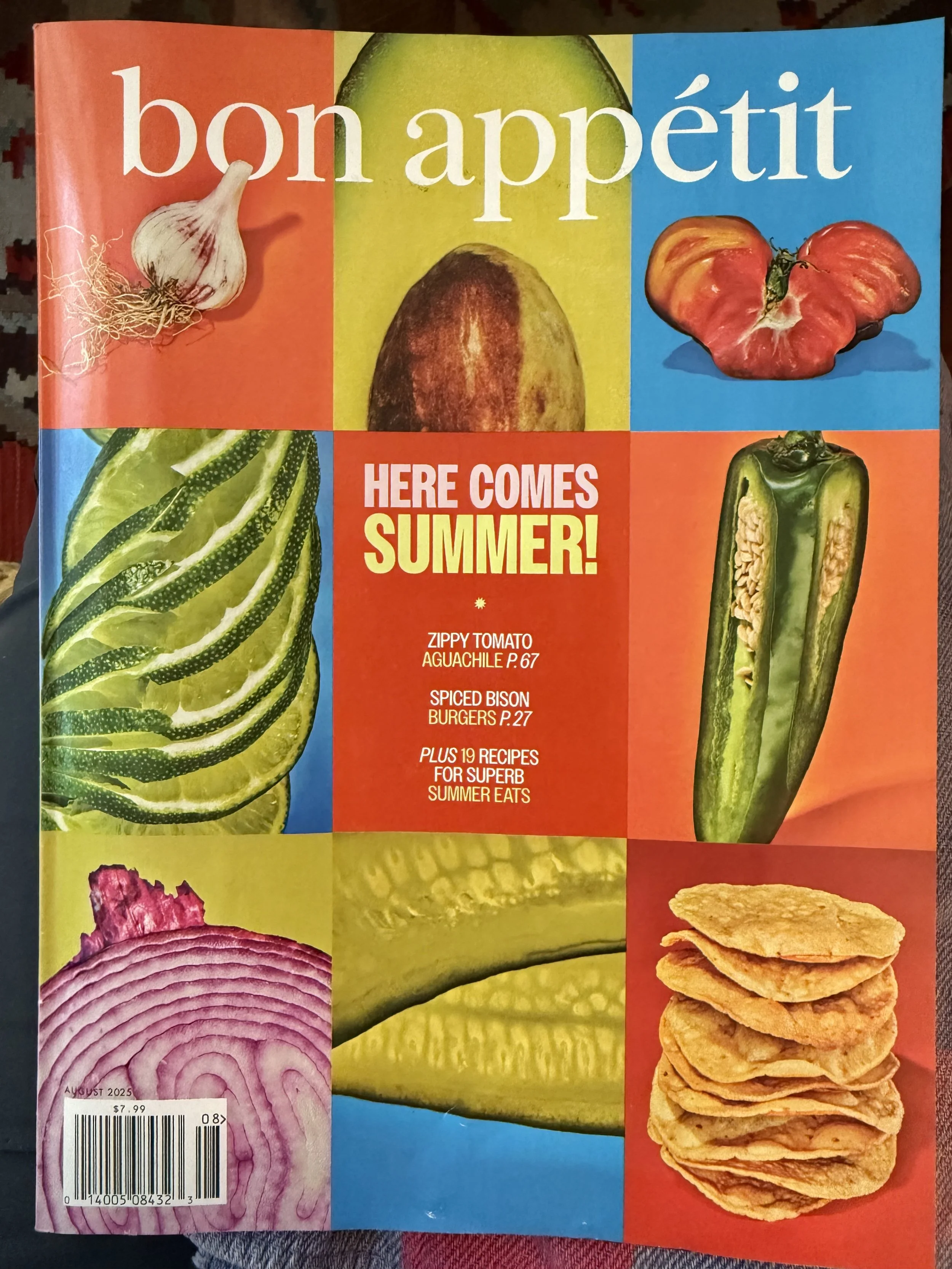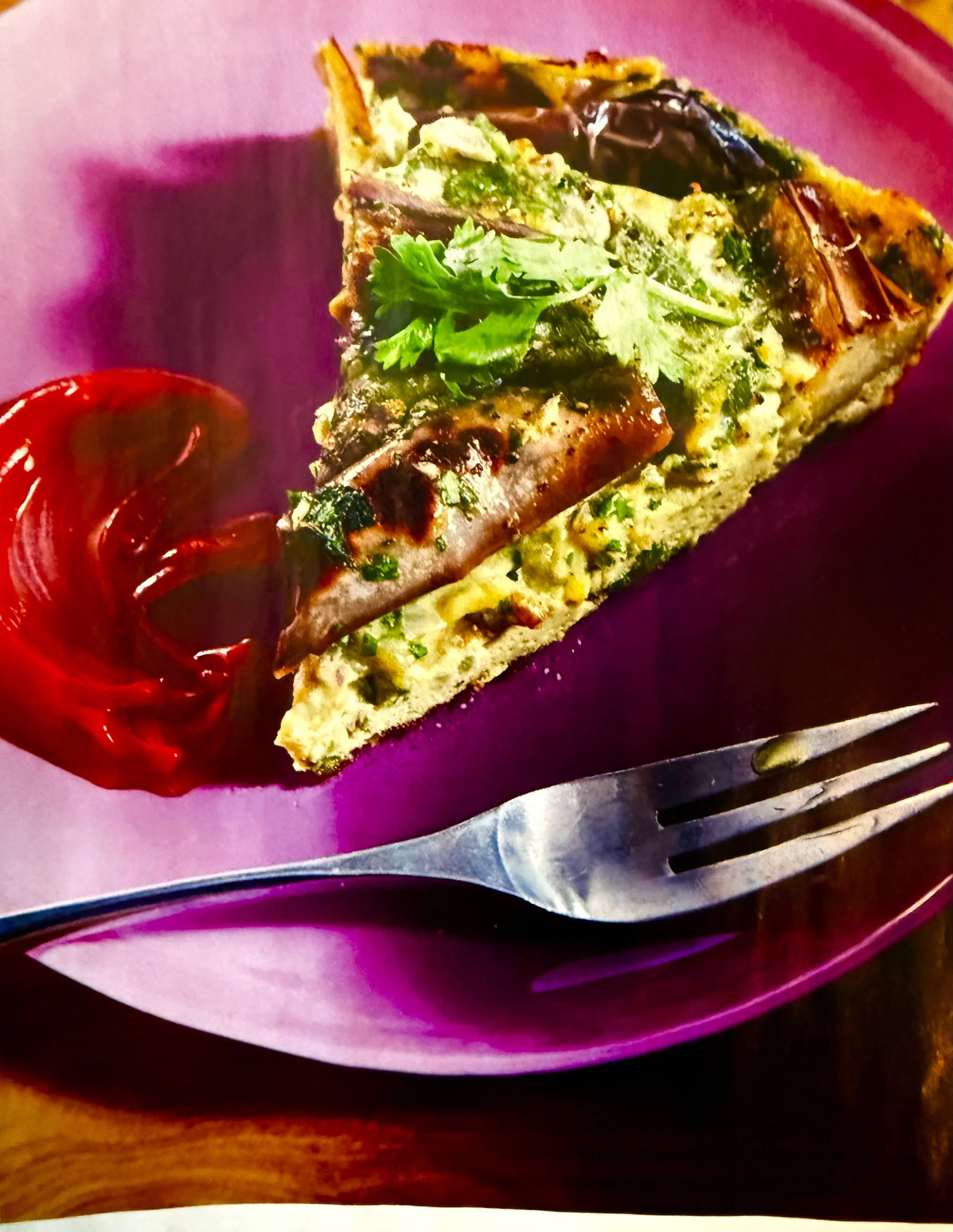 As we visited, Anita bemoaned the fact that deer had eaten all of her parsley the prior night. I have plenty growing in a pot on my deck and also, I had a big bag of dark sweet cherries and some green cukes to share. Before long, Carol and I both ended up in Dolores and Anita’s kitchen again. Carol had cooked up a frittata recipe she’d found my copy of Bon Appétit and wanted to share slices of her colorful creation with the three of us.