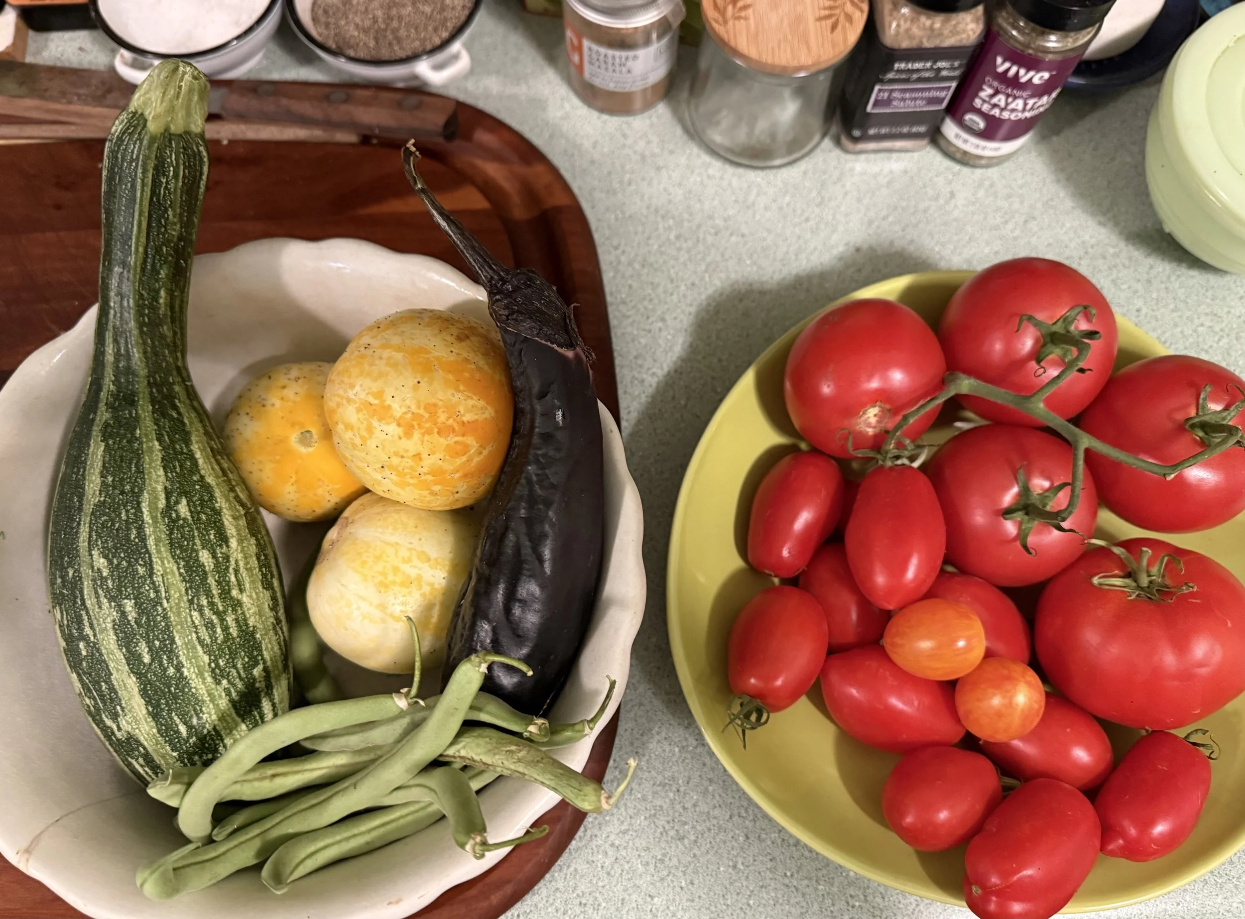 The next day, Nora (a nurse at the Lodge where Kit resides) brought me a bag filled with a bounty of beautiful vegetables that she’d picked that morning from her enormous garden. She had over planted lemon cucumbers that she loves to eat right out of the garden and thought I might like some. She also included tomatoes, a Japanese eggplant, an ornamental squash and a handful of green beans. Gardeners love sharing summer provender and I was delighted to receive the bag of veggies she arrived with that day. In exchange, I took her a box of Baklava that is one of her favorite desserts on the planet. I wish I could say I made them myself, but alas I did not. However, I keep a box of them on hand to share with friends and know where I can always get more.