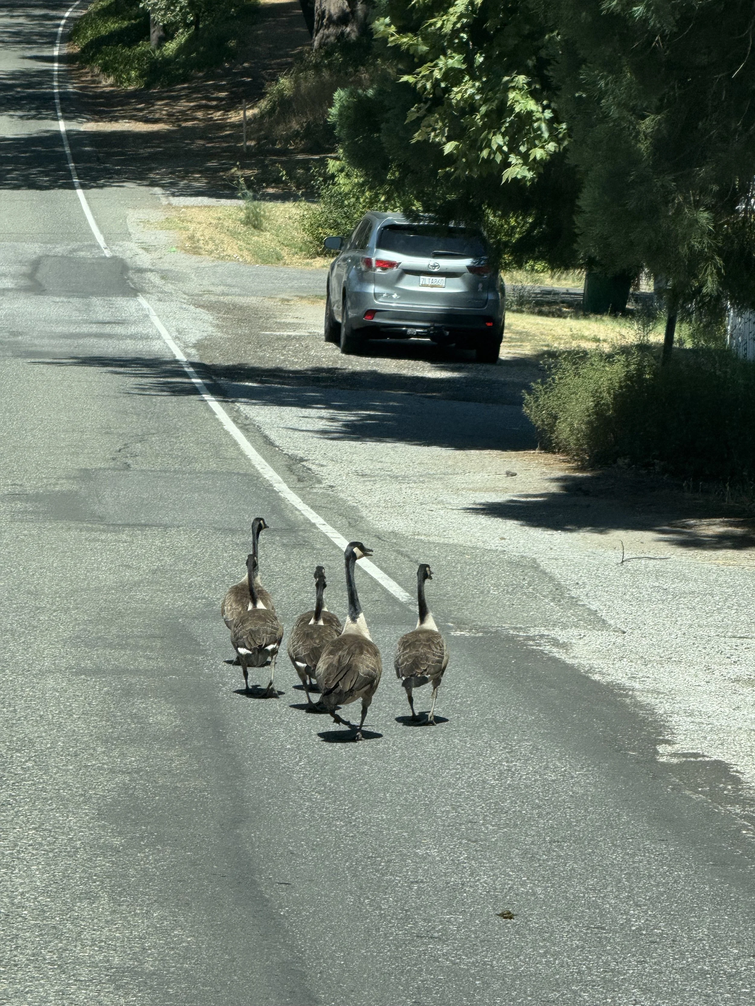 Another day, while driving down the four-mile winding road that takes me to Nevada City’s historic downtown, I came upon a gaggle of five Canada Geese on a morning walkabout right in the middle of the two-lane road. I immediately stopped my car, rolled down my side window and waved them off the road so they wouldn’t get hit. To my relief, the big gander leading the march didn’t honk its displeasure, and opted instead to lead the immature goslings into the safety of a nearby yard.