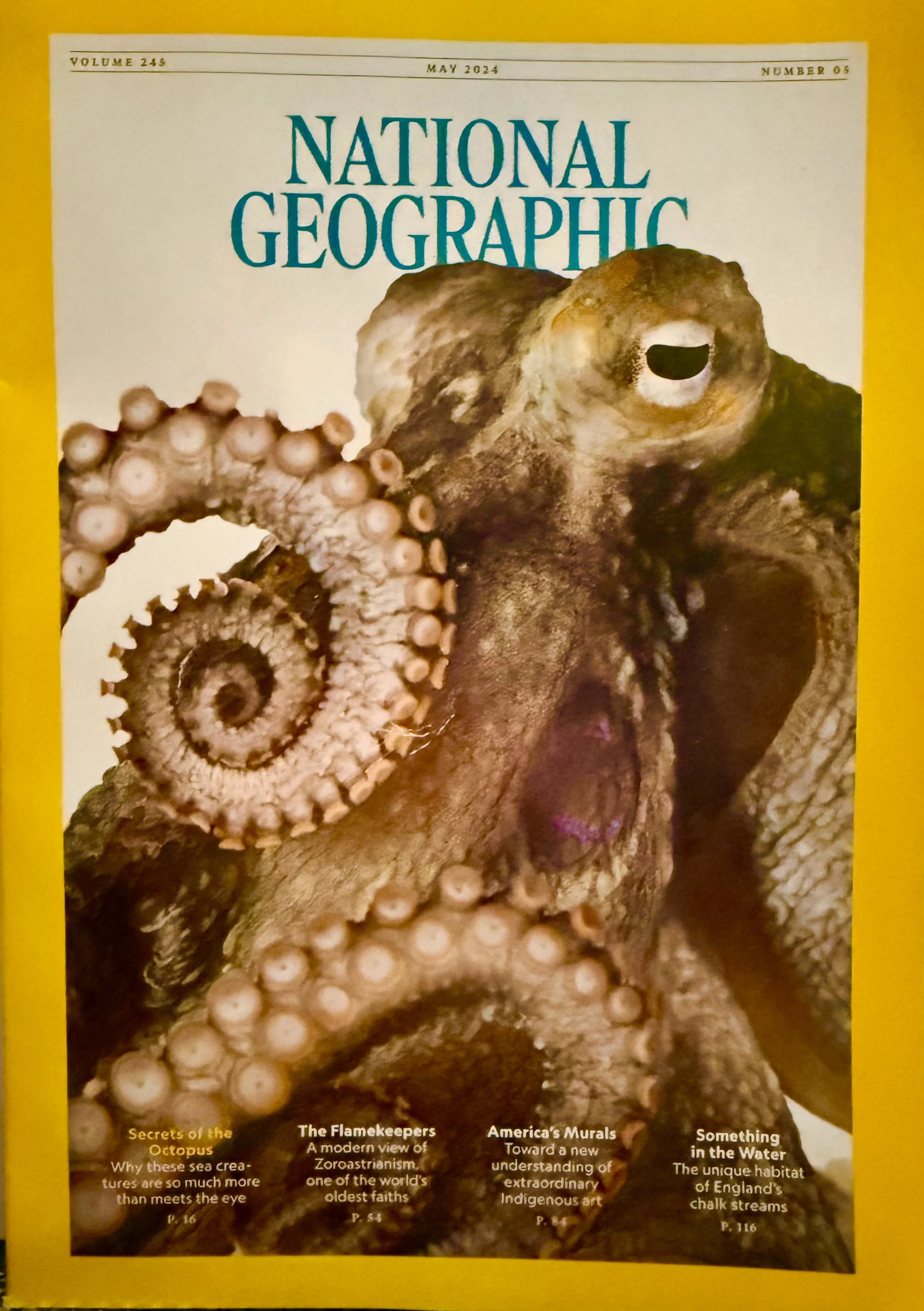 Since the award-winning South African nature documentary was released six years ago, I have watched it numerous times and continue to tell people I meet about it. My interest in learning the secrets of the octopus continued to grow when our May 2024 issue of National Geographic arrived with a cover story dedicated to these remarkable invertebrate sea creatures and “why they are so much more than meets the eye.” NG’s editor Nathan Lump recalls an octopus named Otto that became a 2008 news sensation. “At an aquarium in Germany, he began throwing rocks at the side of his tank and squirting water at the light above it to short-circuit the electrical system.” Why? Because he was bored.