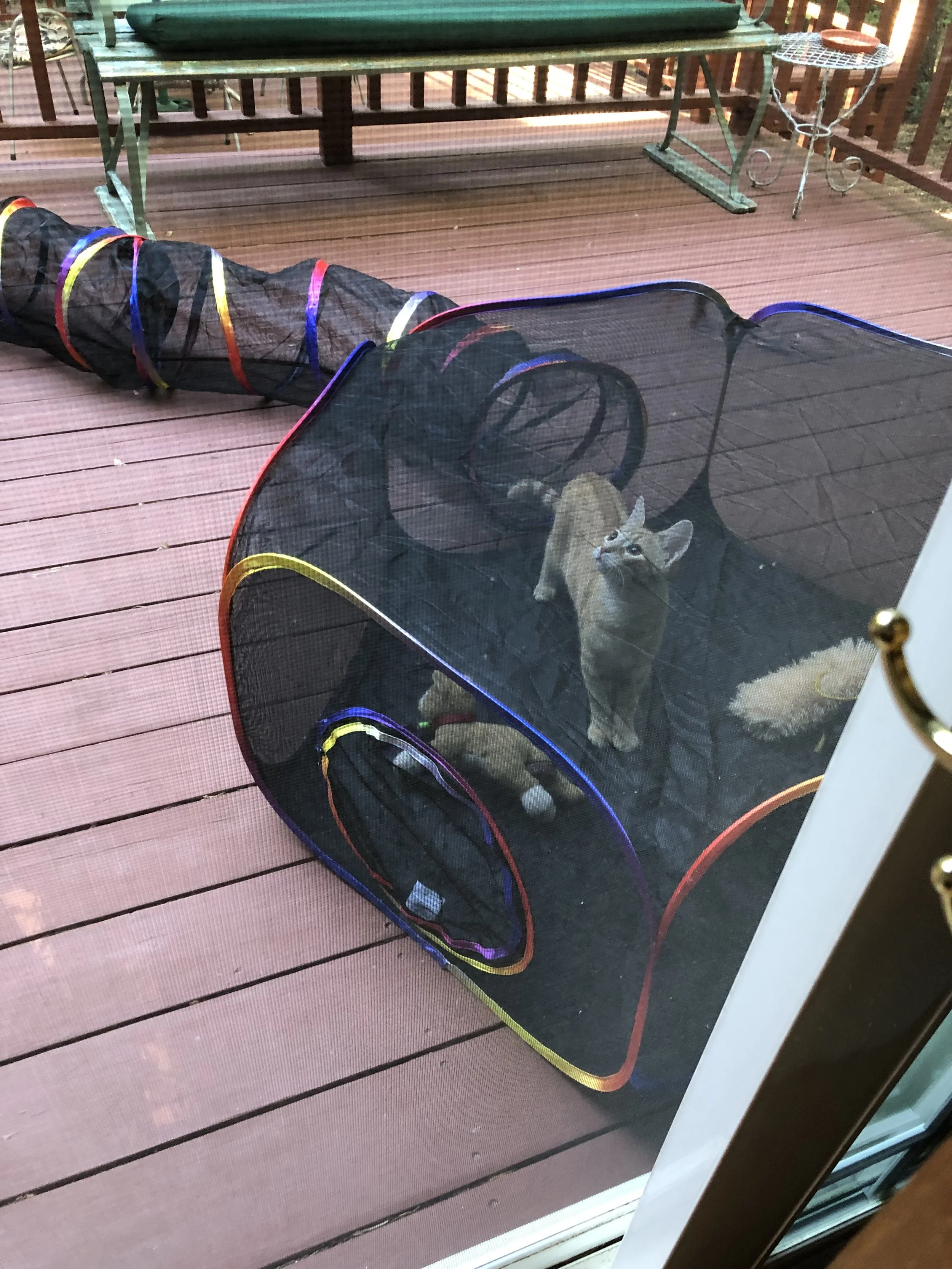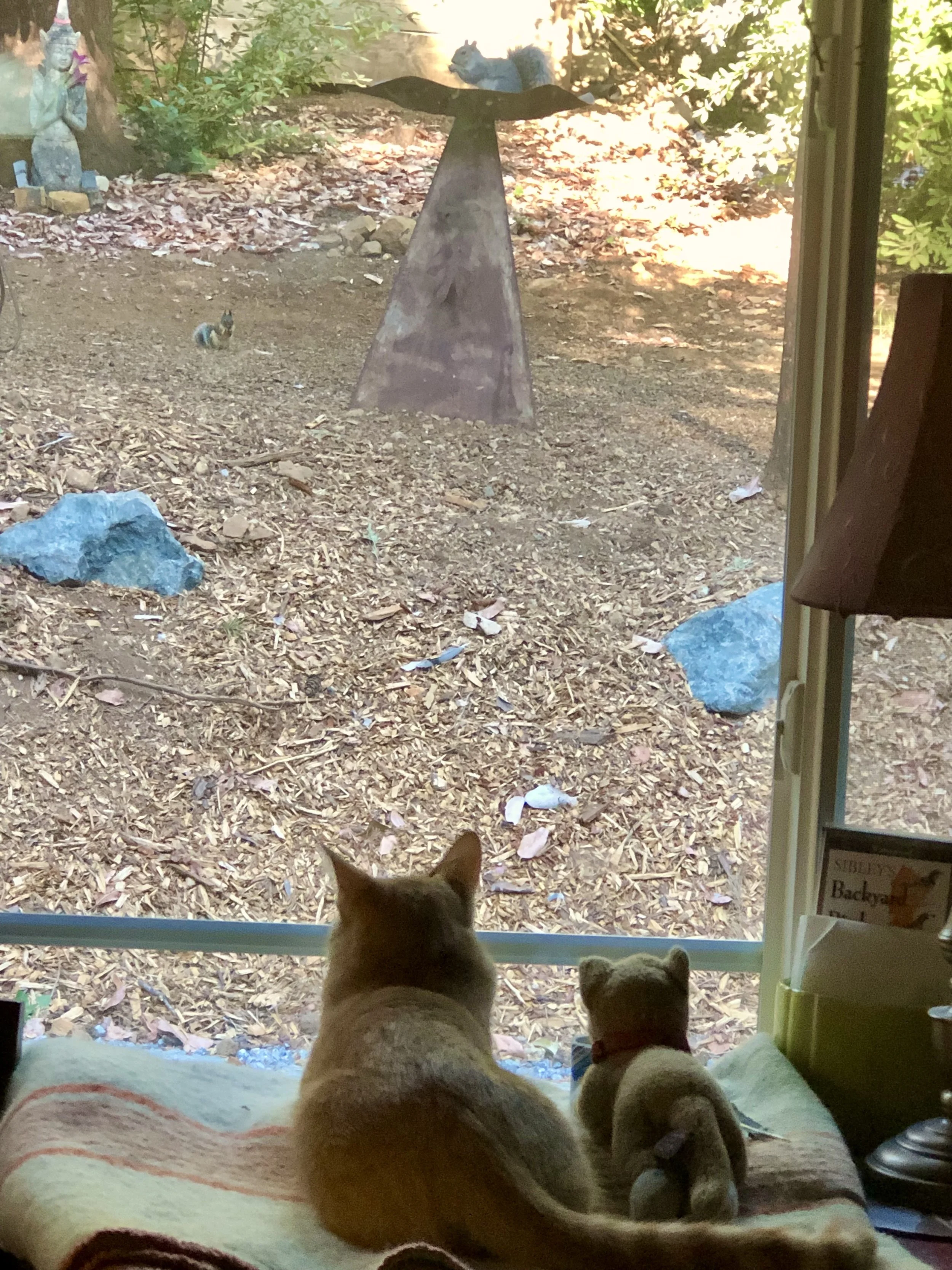 On warm afternoons that are growing increasingly shorter, Peekay spends an hour outside in his collapsible cat tunnel watching autumn leaves twirl as they fall and listening to the sounds from the forest that he looks out on beyond our deck. On rainy days, indoor birdwatching takes place atop a small red café table next to a large glass window that looks out on my meditation pathway. From this lofty perch, he and Peekaboo hunker down to watch the antics of big furry gray squirrels and tiny chipmunk-sized “flying” squirrels as they dash about munching and burying backyard treats that I put out each morning. When Peekay dreams of flying like the little red squirrels, I tell him about the Flying Wallendas—a famous circus family from a century ago. He’s a born acrobat already able to keep his balance effortlessly while walking from end to end on my ballet barre.