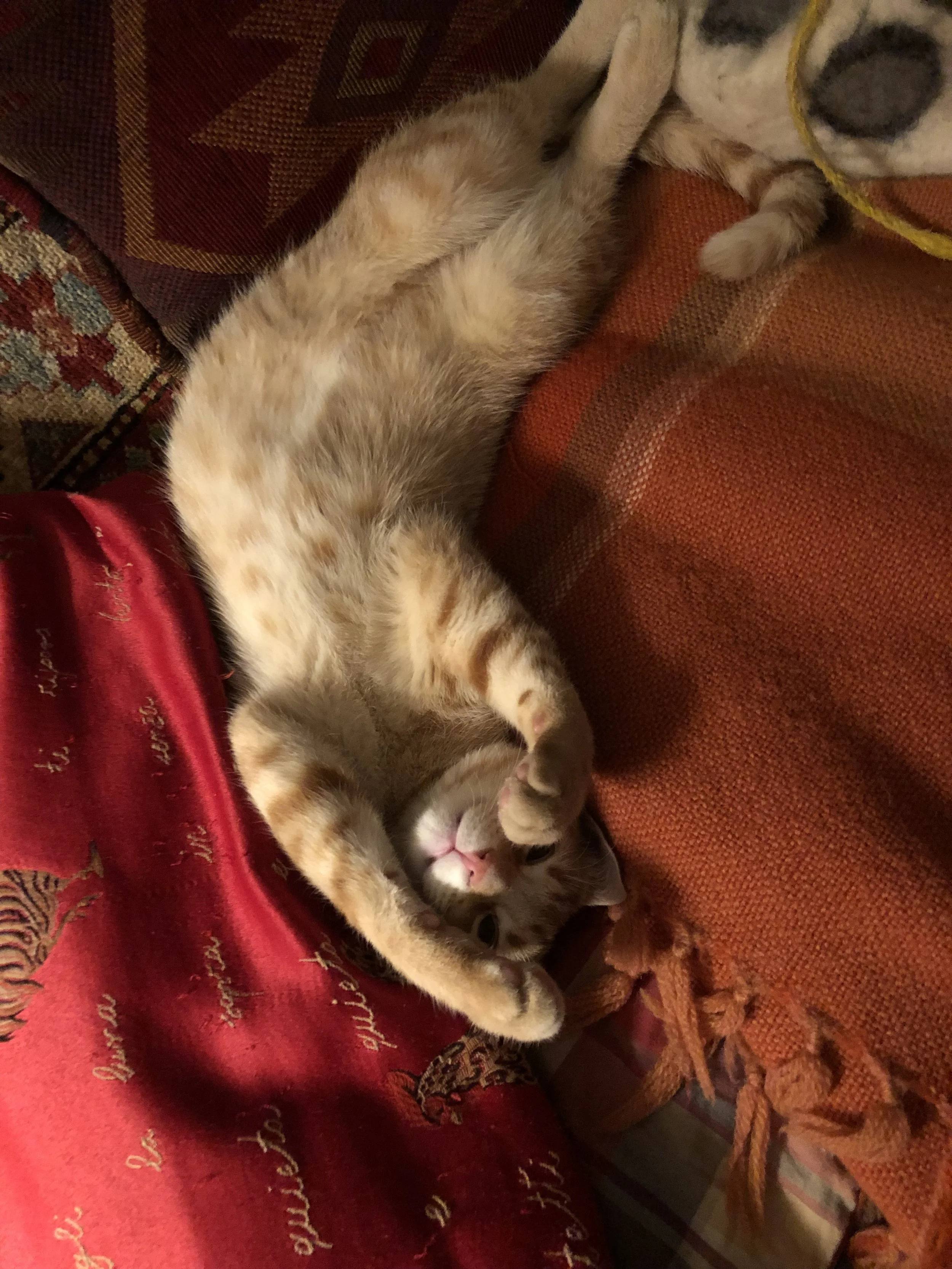 Peekay is an incredibly energetic ginger tabby and Bengal mix—breeds known for their curiosity and athletic prowess. At 5:15 a.m. he stealthily creeps up from the end of the bed and pounces on my head. Play time commences and for the next few hours he explores the house with his stuffed cat toy Peekaboo in his mouth, mimicking my movements, stretched out under my feet when I’m cooking, or trying to distract me while I try to write my weekly blogs. But gradually he’s accepting that some down time is required when I leave for a couple hours midday and in the evenings to be with Kit at the Lodge.