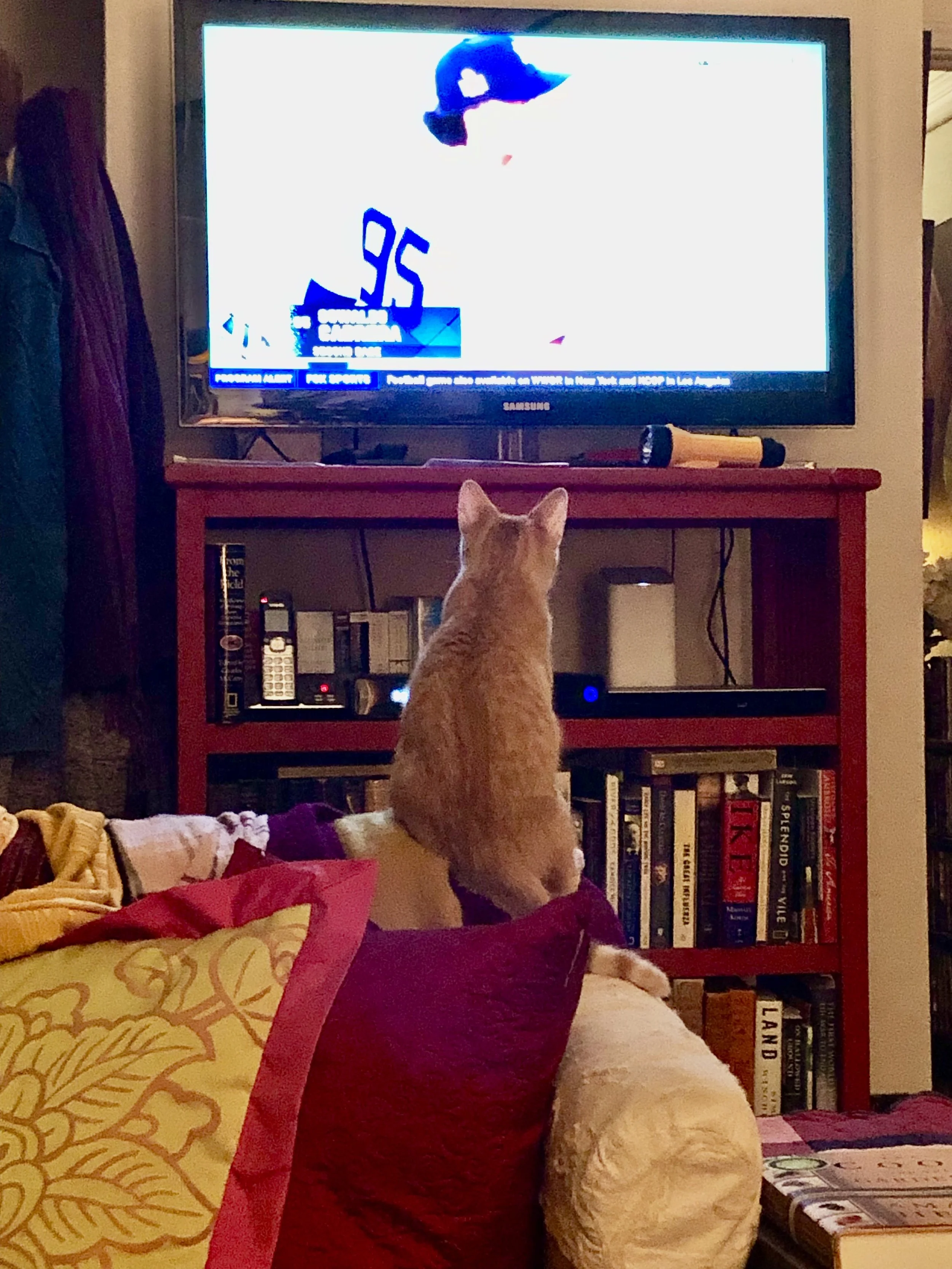 These early November nights, it’s already dark when I get home. By then Peekay is eager to catch, fetch, and pounce on anything resembling a ball. During the 2024 World Series, Kit and I watched the first five innings of each game, and Peekay and I watched the rest after I arrived home.