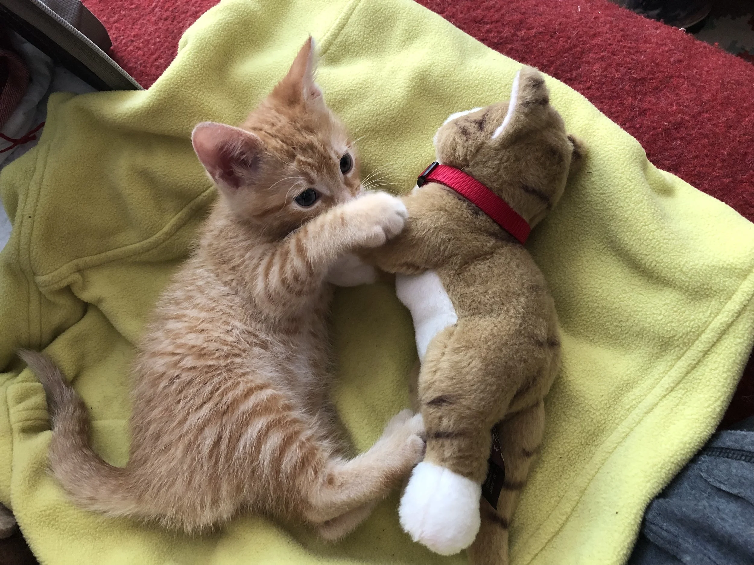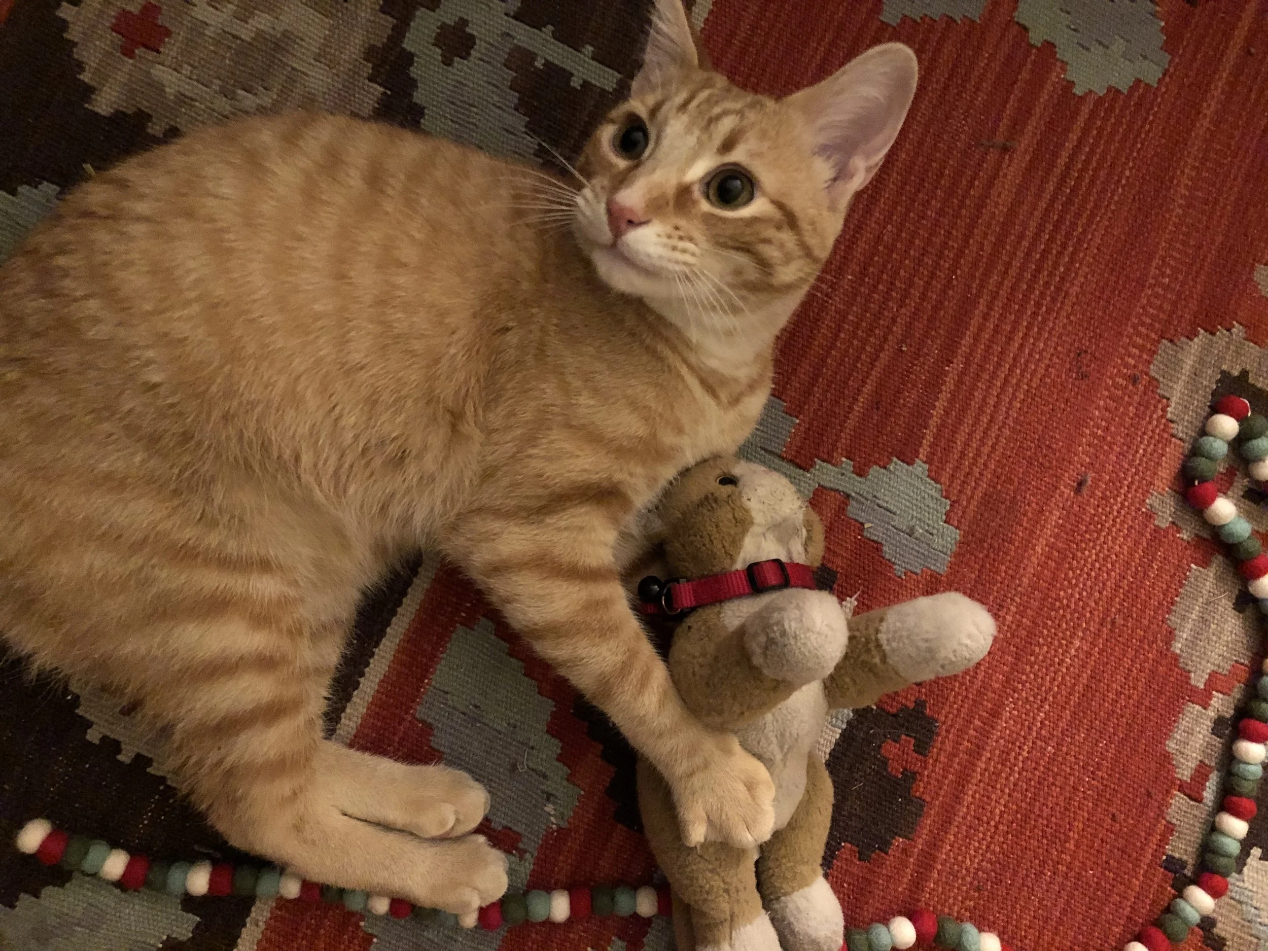 Peekay had never had litter mates, so I brought him home in a little tote with a stuffed toy kitten that looked just like him. Over the past year, the two have remained inseparable friends. Once the same size, Peekay now carries Peekaboo around in his mouth and always remembers where he last left his now whiskerless little friend. Which has me wondering if I should adopt a kitten so he has a real live playmate to chase and wrestle with. More on that thought later.