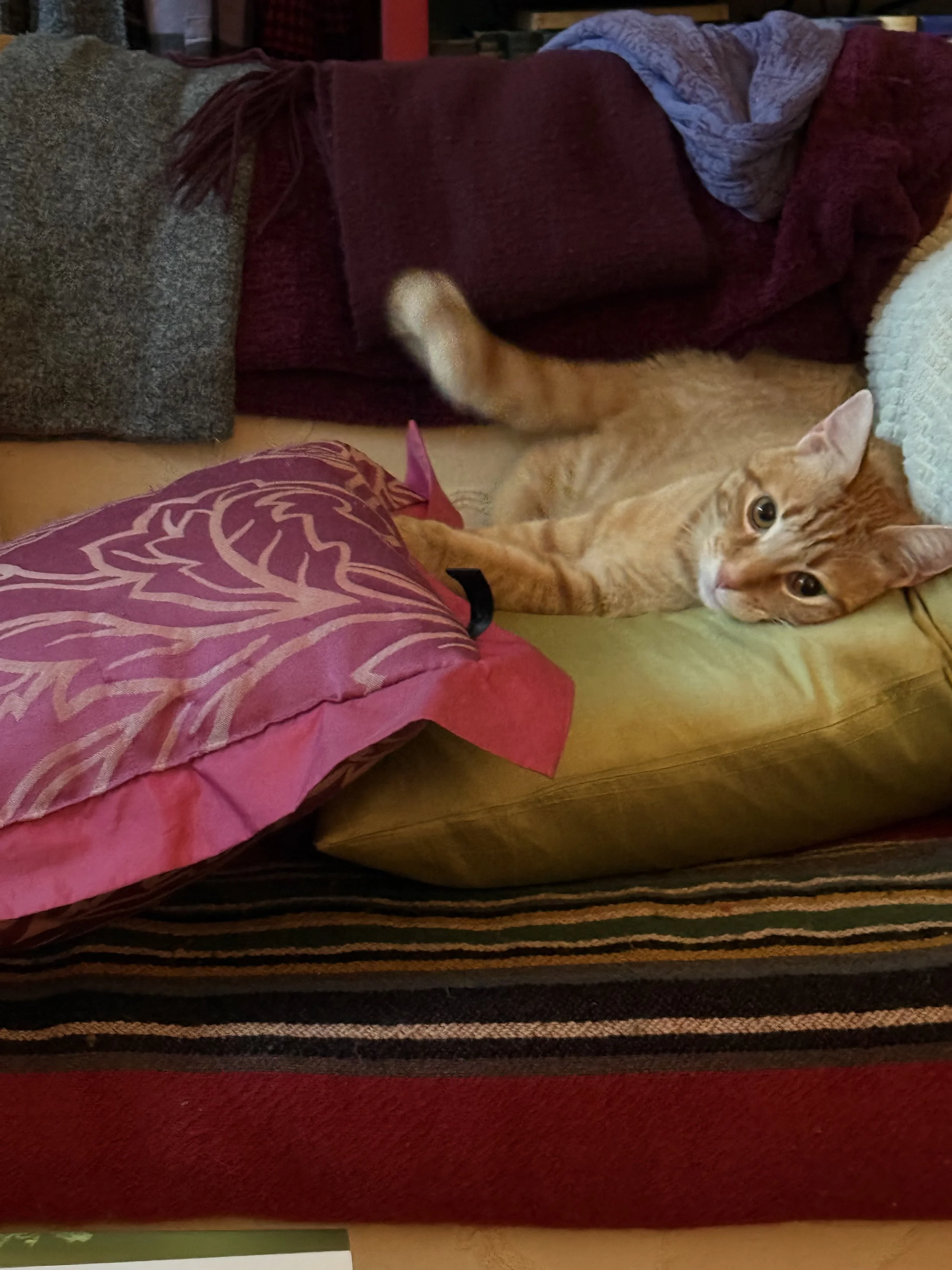 Now fully grown and lordly, he loves snuggling into the lime green and fuchsia colored silk pillows along the back of the couch across from me while I read. As he luxuriates atop the cushions, he gradually sinks into one of his many catnaps, something cats do for hours a day. Nighttime is his time to prowl with Peekaboo in his mouth and play with his other favorite toys (feathers, wadded up pieces of paper, a small soccer ball, catnip-filled squishy toys, pieces of rope, a toy named Mousey, one named Octopussy, a braided strand of sweet prairie grass, and sachets of lavender that he finds even when I think I’ve finally hidden them out of his reach).