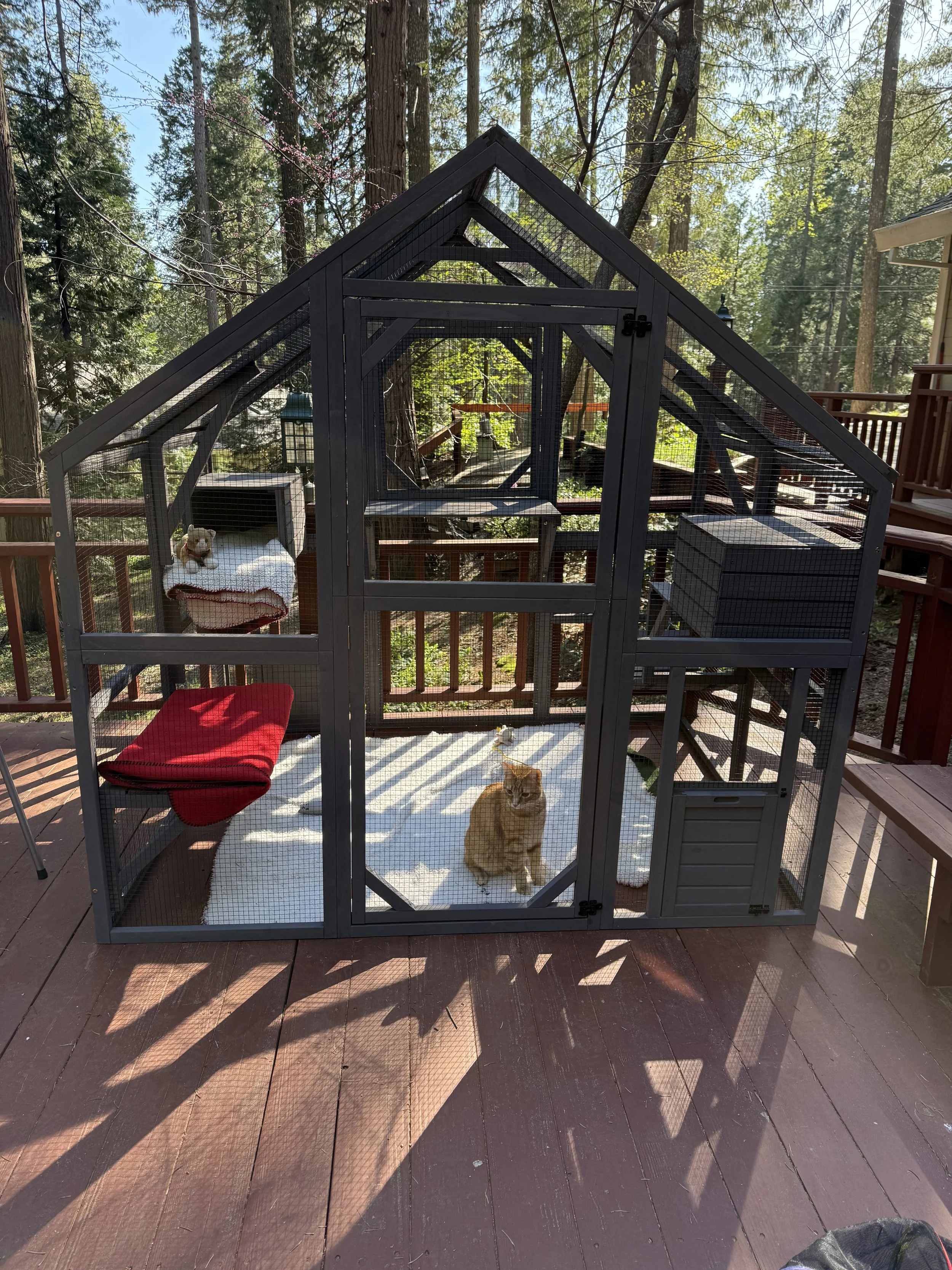 My solution has been to add a Catio enclosure to the deck where Peekay can watch the friendly backyard black capped chickadees that perch and converse in a nearby redbud tree. From inside his Catio where he is surrounded by Peekaboo and friends, Peekay flattens his ears, twitches his whiskers, and softly chitters with excitement. While he birdwatches, I water potted plants on the deck, then pull up a chair with whatever I’m currently reading and keep him company.