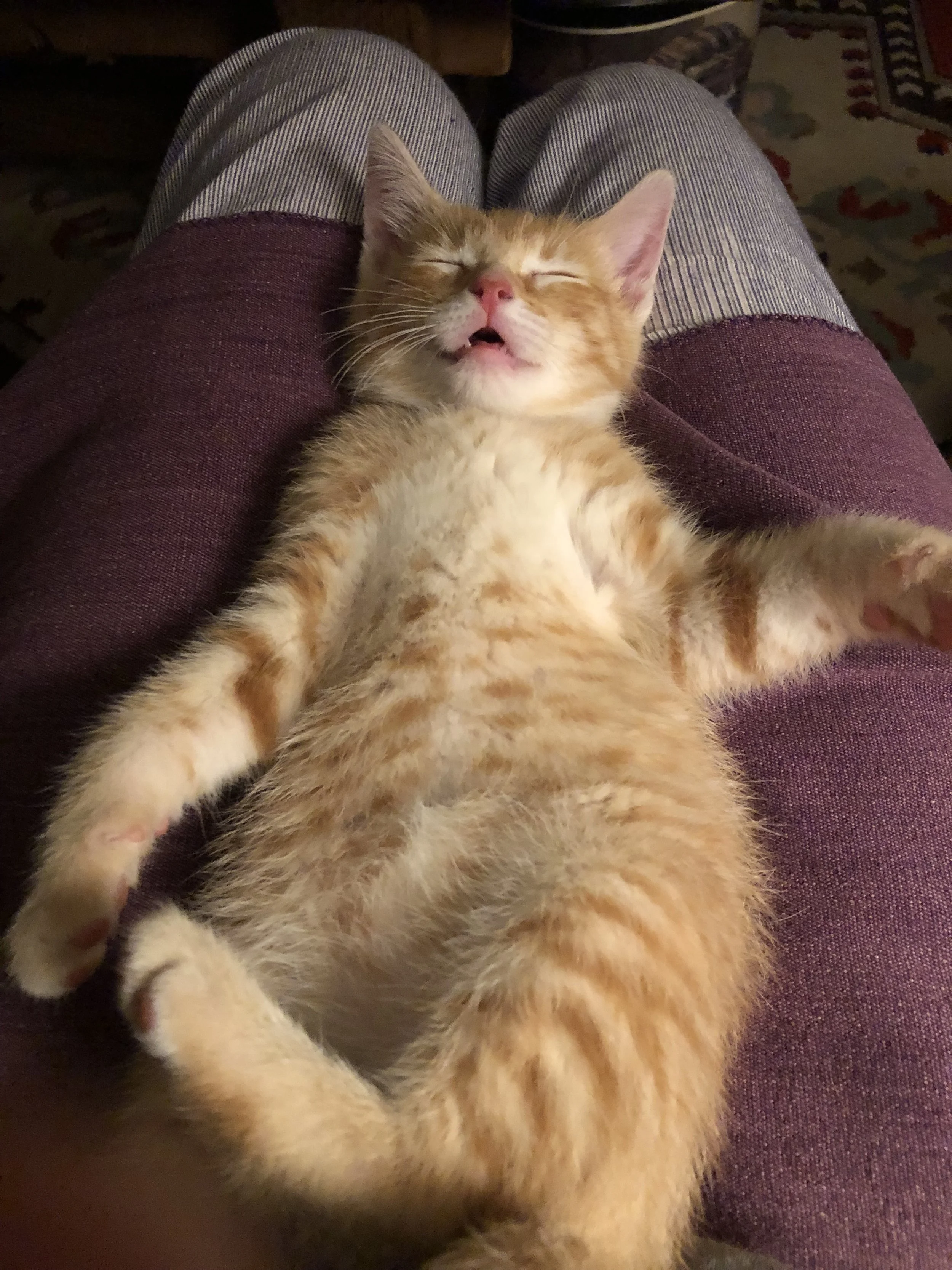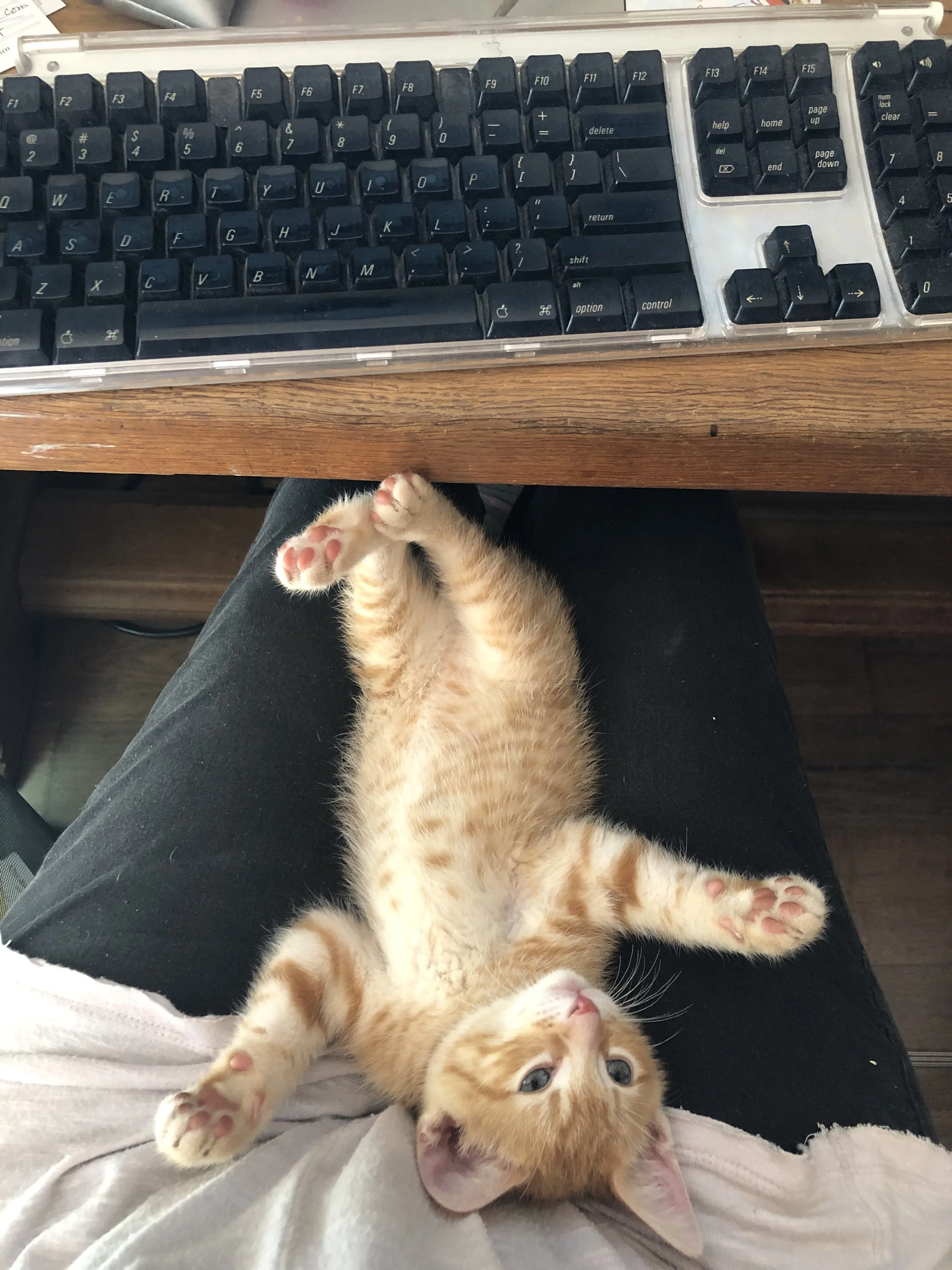 From the get-go, I’ve been photographing Peekay who is without a doubt incredibly adorable and photogenic. It’s tempting to stop describing him and simply fill this blog with his kitten pictures, but I’ll restrain myself and include just a few. This image is one of my favorites. When I first let him wander the house on his own, he’d find me at my computer working on a blog, climb up my pantleg, plop over on his back, and soon fall sound asleep in my lap. This gave me a chance to capture Peekay’s big ears, pink nose, and the gorgeous array of circles and stripes on his belly. Not wanting to disturb him, I had to type with my arms extended out from my desk to allow him snooze space between me and the keyboard.